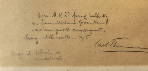 Widmung „Herrn M.U.W. Franz Salficky zu freundlichem Gedenken verehrungsvoll zugeeignet. Prag, Weihnachten 1915. Carl Thiemann“.